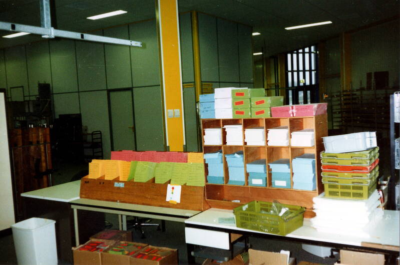 Na het sorteren werden de kratten met werk geleegd in de winkelwagen en vervolgens naar de splice afdeling gereden.