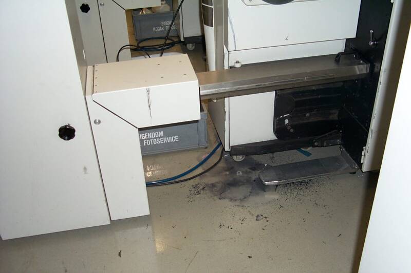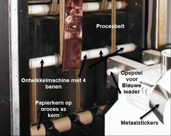 De buffers 4x moeten vol zitten of met leader of met papier. Achter het laatste te printen papier laten we dus blauwe leader afspoelen in de bufferkast of een behoorlijk stuk waste papier. (kan het ontzilveren).