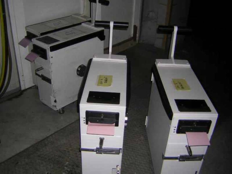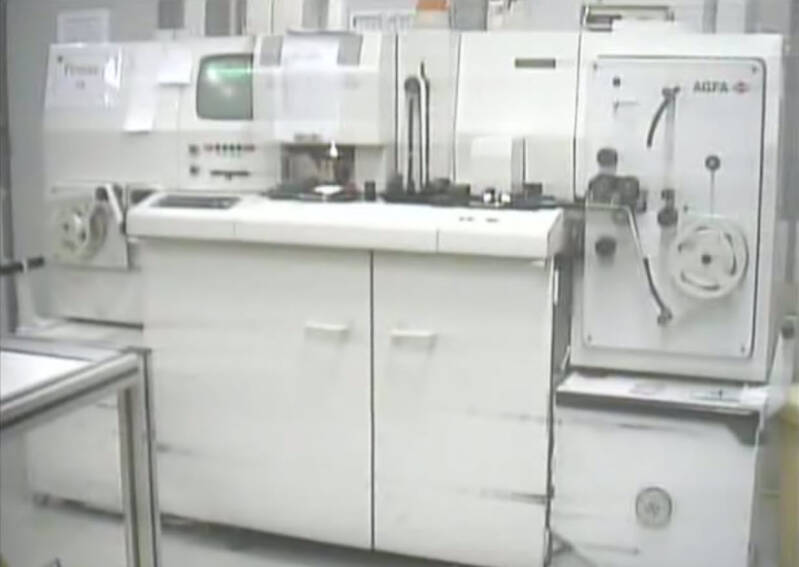 Foto: Zie het reeds ontwikkelde fotopapier langs de belt over de geleiderollen in de droogkast lopen.