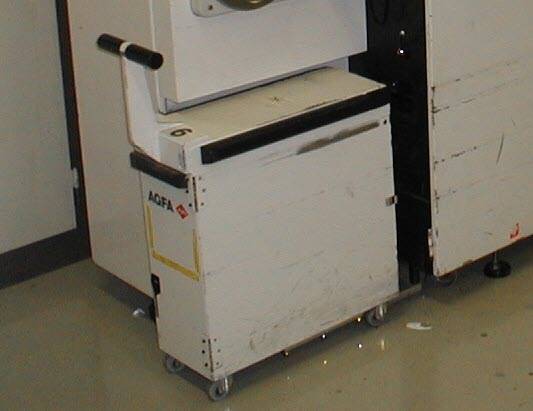 Op de foto rechts zien we 5 banen met fotopapier op een kern in de processor standby om ontwikkeld te worden. (detail: de foto is genomen op de laatste werkdag voordat het lab sloot. We gingen het waste fotopapier ontwikkelen om het zilver in het papier eruit te halen. Onontwikkeld fotopapier valt onder chemisch afval. Daarom dus in het licht.)
