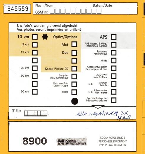 Er kunnen keuzes gemaakt worden voor film type bv. Dia, 135 of APS, papiersoort mat of glans, zijde glans of Royal papier. De klant kan er ook voor kiezen om een nabestelling in te dienen. Bijzonderheden mogen in het daartoe aangegeven vakje genoteerd worden.